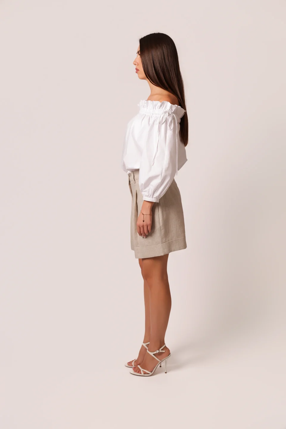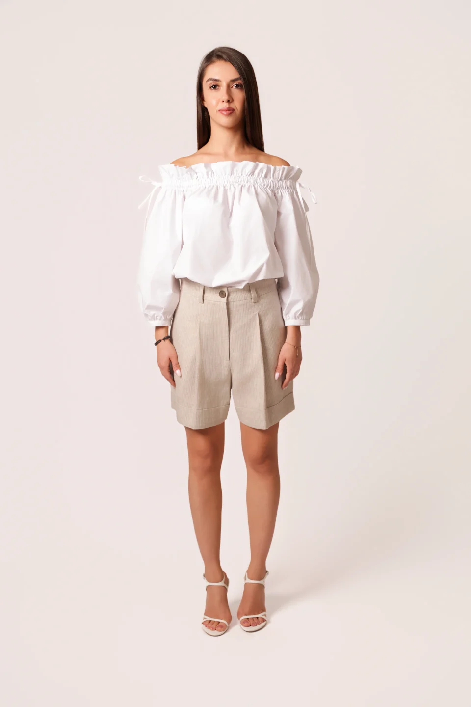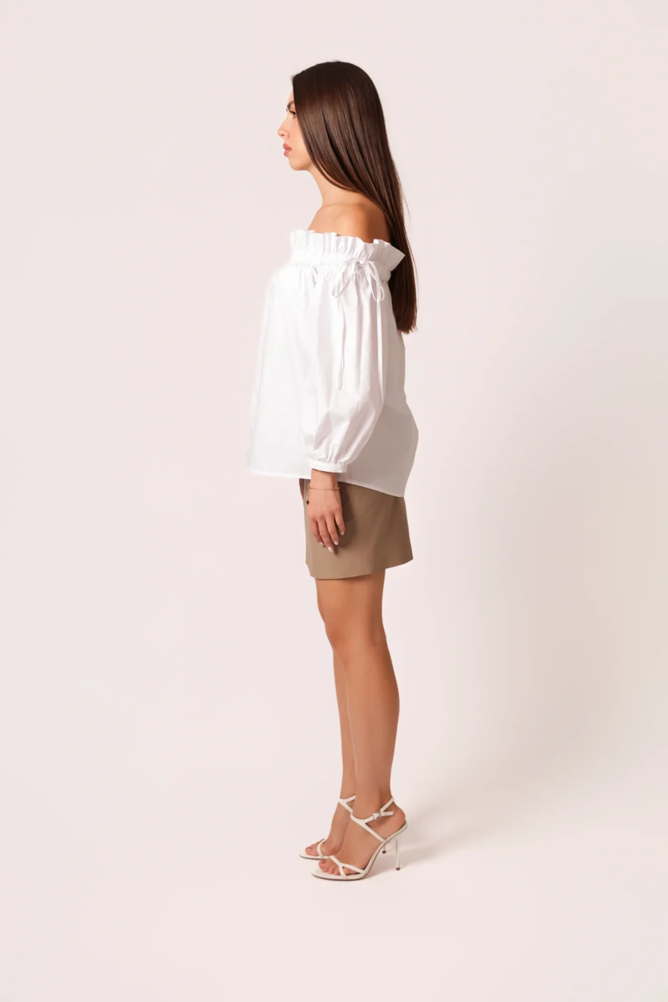 Bomber jacket in beige taupe, featuring a clean, refined silhouette. Designed with a high-closing collar, front metal zipper, and adjustable drawstring at the hem for a personalized fit. The embroidered Caterina Mato logo on the sleeve adds a subtle signature touch — blending urban comfort with minimalist sophistication.