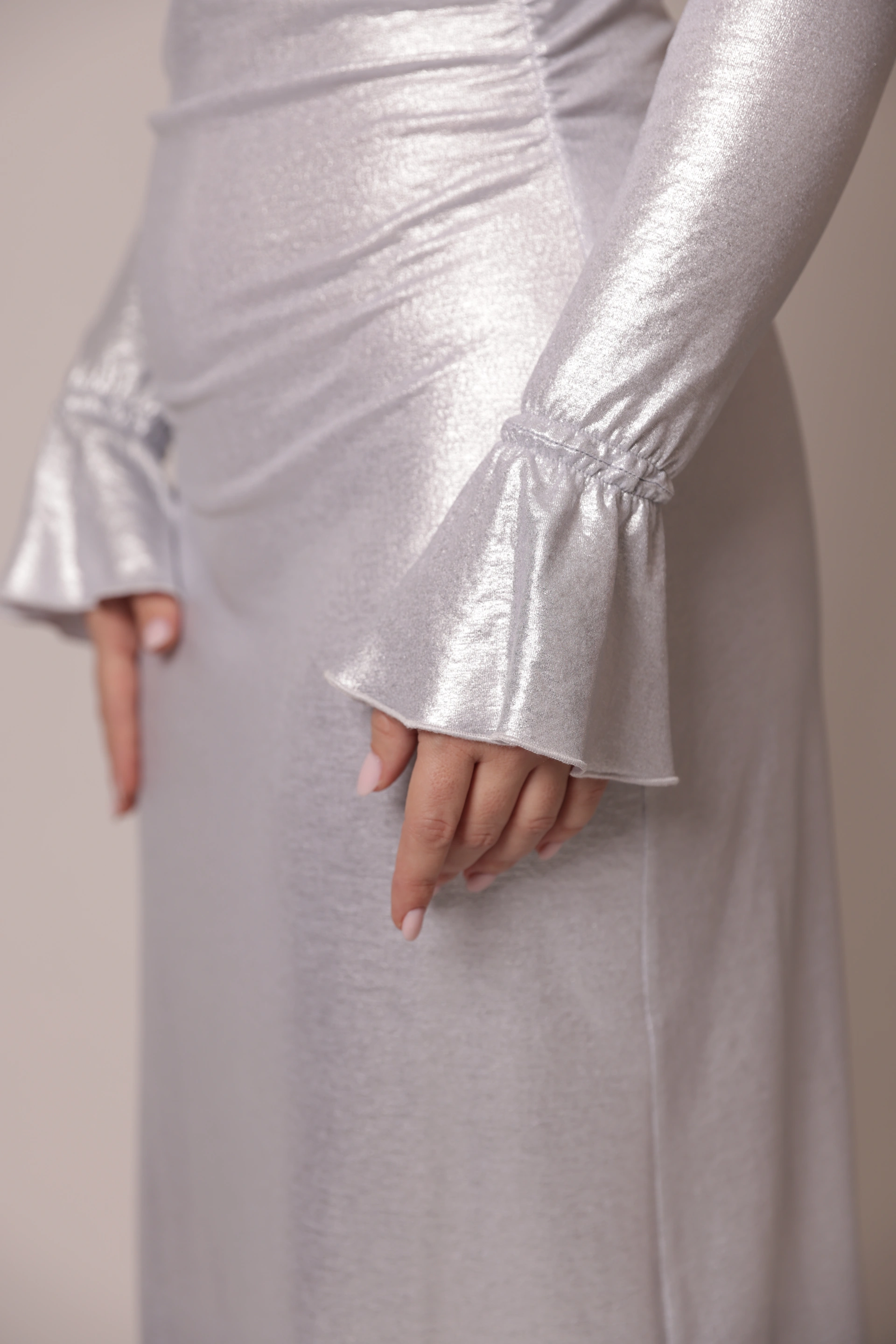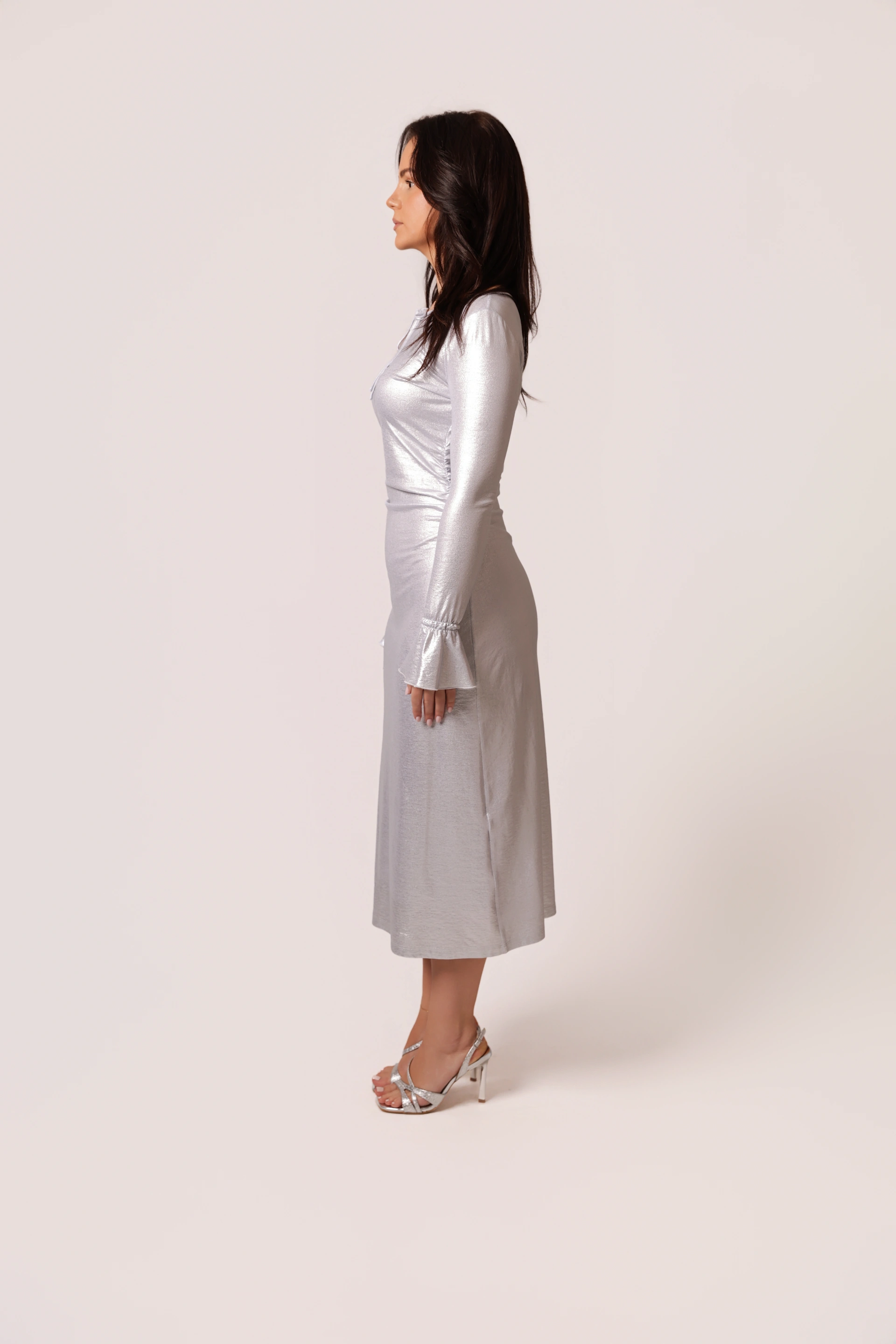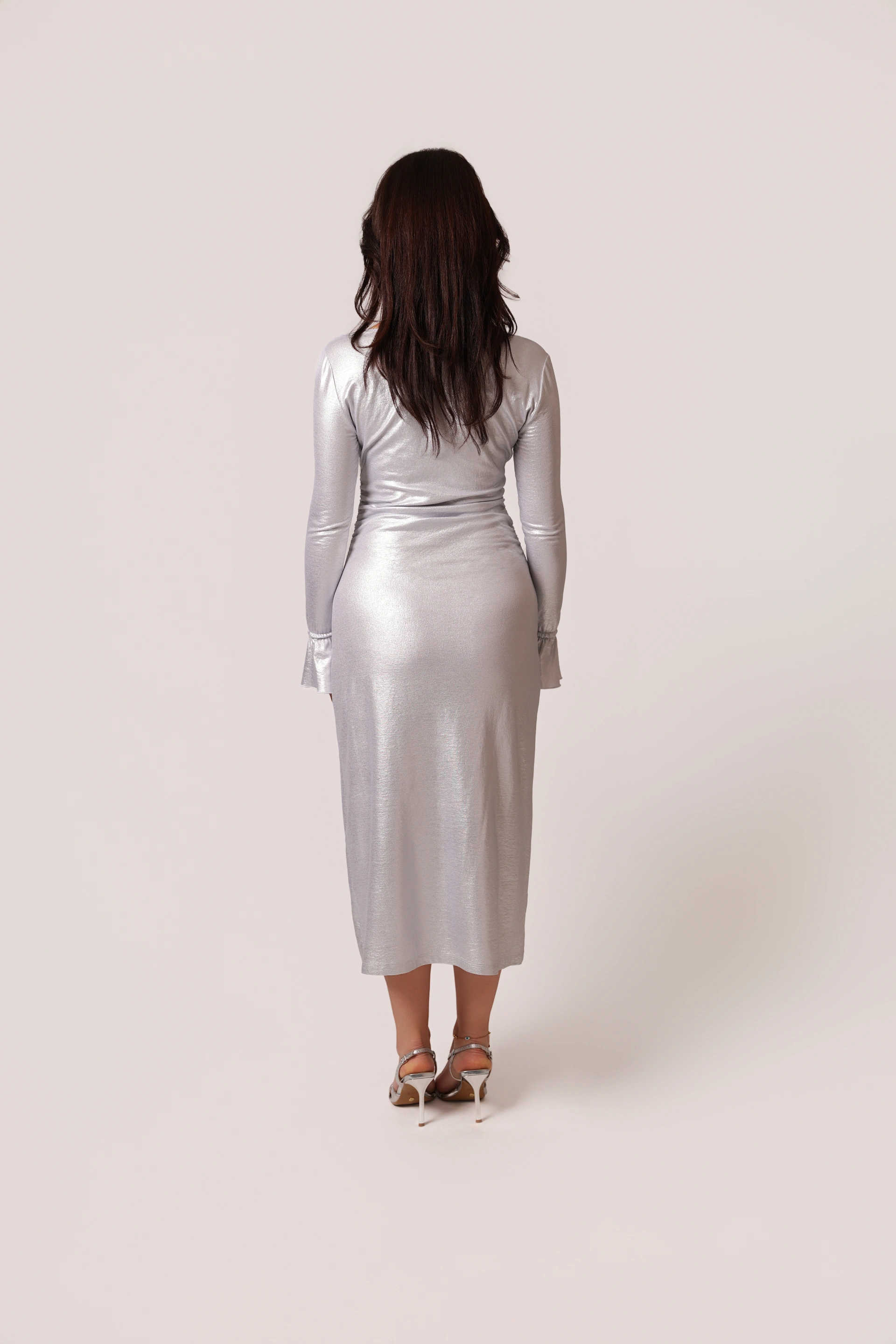 Silver metalizzato cotton dress with a refined front tie opening. Back-set sleeves create a clean silhouette, and the bell-shaped hem, along with the unique sleeve-to-hem attachment, highlights sophisticated, signature design.